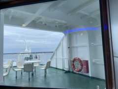 ラウンジは軽食兼歓談スペースといった形ですが、一人でいる身からするとただの軽食スペースとなります。ただ、海を見ながら腰を落ち着けることができるので、寝台に居続けて気が鬱屈としてきたら気分転換としてとてもいいです。ジュースを買って本読んだりとかもいい感じです。食堂みたいに混みすぎず、いつ行っても満員にはならないのもいいですね。