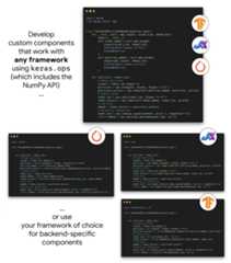 , your custom layers,custom losses, custom metrics, and custom optimizerswill work with JAX, PyTorch, and TensorFlow — with the same code.That means that you can maintain only onecomponent implementation (e.g. a singlemodel.py