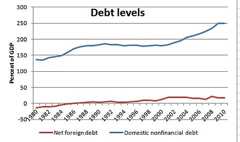 Below are two series, both expressed as percentages of GDP: total domestic nonfinancial debt (public plus private), and U.S. net foreign debt, as measured by the negative of the net international investment position: