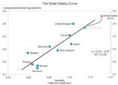Below is what he dubs the Great Gatsby Curve. On the horizontal axis is the Gini coefficient, a measure of inequality. On the vertical axis is the intergenerational elasticity of income — how much a 1 percent rise in your father’s income affects your expected income; the higher this number, the lower is social mobility.