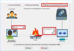 次の設定画面は、トンネリングの全体像が分かりやすく表現されています。右上の「Dynamic port forwarding」を選び、左側に使用するポート番号を入力、右下に接続先のホスト名、ユーザー名、ポート番号を入力してください。入力後、「Save」をクリックします。