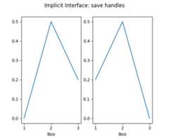 importmatplotlib.pyplotaspltaxs=[]ax=plt.subplot(1,2,1)axs+=[ax]plt.plot([1,2,3],[0,0.5,0.2])ax=plt.subplot(1,2,2)axs+=[ax]plt.plot([3,2,1],[0,0.5,0.2])plt.suptitle('Implicit Interface: save handles')foriinrange(2):plt.sca(axs[i])plt.xlabel('Boo')