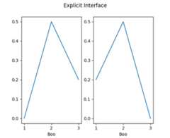 importmatplotlib.pyplotaspltfig,axs=plt.subplots(1,2)axs[0].plot([1,2,3],[0,0.5,0.2])axs[1].plot([3,2,1],[0,0.5,0.2])fig.suptitle('Explicit Interface')foriinrange(2):axs[i].set_xlabel('Boo')