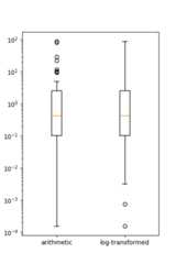 importnumpyasnpimportmatplotlib.pyplotaspltfrommatplotlibimportcbooknp.random.seed(0)fig,ax=plt.subplots(figsize=(4,6))ax.set_yscale('log')data=np.random.lognormal(-1.75,2.75,size=37)stats=cbook.boxplot_stats(data,labels=['arithmetic'])logstats=cbook.boxplot_stats(np.log(data),labels=['log-transformed'])forlsdictinlogstats:forkey,valueinlsdict.items():ifkey!='label':lsdict[key]=np.exp(value)stats.extend(logstats)ax.bxp(stats)fig.show()