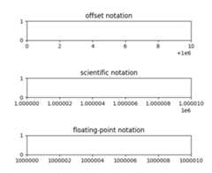 Offset notation and scientific notation look quite similar at first sight.Both split some information from the formatted tick values and display itat the end of the axis.