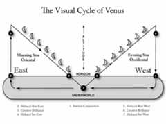 Venus’ visible cycle begins with her eastern appearance as Morning Star, which lasts about 258 days. This is separated from her western appearance as Evening Star by 60 days of darkness (invisibility), as she slowly passes through the crucible of the solar fire during her superior or exterior (direct) conjunction with the Sun. Venus then spends another eight months or so shining in the west as Evening Star. So, about 95% of Venus’ visual cycle involves a slow transmutation of over 18 months, and includes her morning star, underworld, and evening star incarnations. (It is18 months from first morning appearance to last evening appearance.)