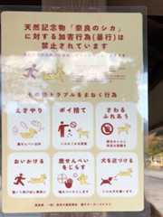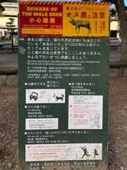 奈良県警かどうかは不明だが、どこかが看板で、外国語で注意喚起していることは事実である。だが、「たたいたり、追いかけたりしない」とまず日本語で書いた後、英語、中国語、韓国語も併せて記している。しかも、これは発情期の雄のシカに対する注意喚起がまず最初である(写真上)。日本語だけの注意喚起もある(写真下)。だけど、首相のような言い方をすると、日本人はいいのだけど、外国人は要注意だ、というふうに受け取られてしまうし、邪推すれば、彼女はそれを狙っているのではないだろうか。