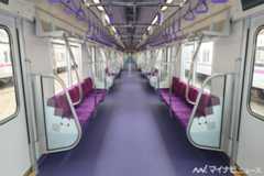 内装に関して、全号車にフリースペースを配置し、ドア下部の傾斜やフリースペース付近のドアレールの切欠き加工など、17000系と共通する特徴も見られるが、座席や吊り革、床面には色味の異なる紫色がふんだんに取り入れられ、17000系とは異なる空間になっている。17000系はモノトーンの空間にラインカラーをアクセントに添えた印象だったが、18000系はラインカラーを徹底的に取り入れることで、優しくも個性的な空間に仕上がっているように感じられた。なお、優先席は背もたれが赤色となっている。