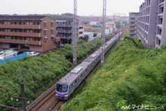 さて、元町・中華街駅を発車した17000系の「Fライナー」特急は、全線地下区間のみなとみらい線を走行し、横浜駅から東急東横線へ。東白楽駅の手前でトンネルを抜け、同駅通過直後に高架から地上へ降りてくる。このあたりは住宅地になっている上に、踏切やカーブもそれなりに多い。地下鉄の車両が地上に出て、住宅地を縫って走る光景はなかなか印象深い。