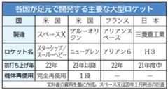 政府は打ち上げ後のロケット機体の一部を回収して使う「再使用型」を2030年頃に打ち上げる方針を示した。再使用型にすることで打ち上げ費用を大幅削減し、21年度中にも打ち上げられる大型基幹ロケット「H3」の約半分にする計画だ。海外では宇宙開発スタートアップが台頭し、コスト面で優位性を持つ。日本が国際競争力を高めるには、技術力とともに運用コストの低減がカギを握る。(飯田真美子、孝志勇輔)
