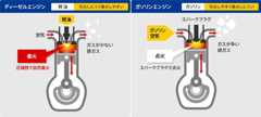 構造的にはガソリンエンジンよりもシンプルなのだが、あの黒煙が発生する欠点があった。現在はその黒煙の元となる物質を燃焼させることによりクリーンな排気ガスを可能としている。