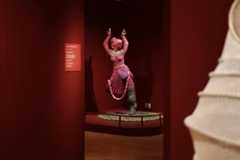 In the center of the entrance stands a large sculptural piece, named “she arose (from a pool of tears,” which showcases the intricate footwork, hand gestures and body movement of Bharatnatyam, a traditional South Indian dance. The piece, made by multidisciplinary artist Suchitra Mattai, is composed of vibrantly colored saris braided together to honor the artist’s heritage and the cultural exchange between everyone who wore them. The work becomes not just a garment, but a connection to culture, and a symbol of resistance and tradition.