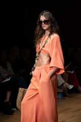 A standout look featured a two-piece coral set: open sleeves, matching wide-leg pants and a long necklace of medallions and large beads that extended past the waist. The outfit was punctuated with a pair of oversized frames, adding glamour to the collection’s otherwise effortless spirit.