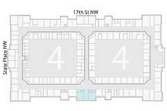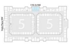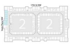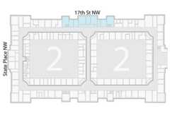 Located on the 17th Street, center corridor side of the EEOB, the West Rotunda was designed for the Department of War by Richard Ezdorf, chief draftsman for the Supervising Architect of the Treasury; completed in 1888.