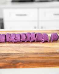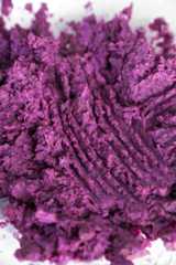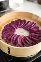 - Steam the peeled and sliced purple sweet potatoes for about 20 minutes until soft.