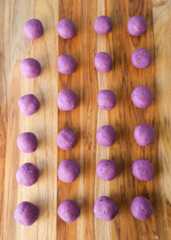 - Once fried, remove the purple sweet potato balls from the oil. Transfer to a plate lined with a paper towel. Serve warm and enjoy!