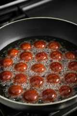 FRY: In a large frying pan or pot, add oil and heat to medium. Carefully drop each sweet potato balls into the oil. Fry for about 8 minutes or until golden brown and puffy. Use a strainer or skimmer to keep swirling and gently press down the balls.