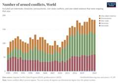 As the chart shows, at least 150 ongoing armed conflicts have been recorded each year recently. This number is up from previous decades, but even then, it rarely fell below 100, and there has been no year without armed conflictfor centuries.