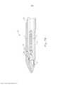 [0097] No exemplo mostrado, o recurso compressível (496) entra em contato com uma região de tecido (90) que está substancialmente alinhada com as canaletas (62, 72). Conforme mostrado na Figura 16C, à medida que o elemento de faca (80) se desloca ao longo das canaletas (62, 72), o elemento de faca (80) corta simultaneamente o tecido (90) e desloca as aletas (498a, 498b) na direção oposta ao plano vertical central do atuador de extremidade (440) que se estende longitudinalmente, de modo que as aletas (498a, 498b) são impelidas para longe da canaleta (72) e posicionadas contra os respectivos lados do elemento de faca (80). Além disso, o elemento de faca (80) aciona o deslizador em cunha (78) distalmente à medida que o elemento de faca (80) translada distalmente através do atuador de extremidade (440), empurrando, assim, os grampos (77) através do tecido e contra a bigorna (460) para formação, da mesma forma descrita acima em relação ao atuador de extremidade (40).[0097] In the example shown, the compressible resource (496) contacts a tissue region (90) that is substantially aligned with the grooves (62, 72). As shown in Figure 16C, as the knife element (80) travels along the channels (62, 72), the knife element (80) simultaneously cuts the fabric (90) and moves the fins (498a, 498b ) in the opposite direction to the central vertical plane of the end actuator (440) which extends longitudinally, so that the vanes (498a, 498b) are urged away from the groove (72) and positioned against the respective sides of the knife element ( 80). Furthermore, the knife element (80) drives the wedge slider (78) distally as the knife element (80) translates distally through the end actuator (440), thereby pushing the clamps (77) through tissue and against the anvil (460) for forming, in the same manner described above with respect to the end actuator (40).