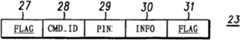 图4所示为根据本发明的一个实施例的特殊文本信息23的示例性格式。此格式开始为一初始化标志27,用于标志特殊文本信息23的开始。初始化标志27也可以是一特定字节,其在第一无线设备20中被预先编程,用于标志一特定顺序的特定呼叫和信息转发信息紧跟着初始化标志27。例如,一指令ID 28可以包含某一数目的字节,用于标志第一无线设备20的呼叫转发是否应被打开或关闭、第一无线设备20的信息转发是否应被打开或关闭。指令ID 28的其他字节可以为其他操作备用,如是否要显示一屏幕弹出信息25。特殊文本信息23的后续字节可以包括一个人身份识别号码(PIN)29,用于为系统提供附加的安全性,以使只有被授权的用户可以打开或关闭信息转发功能。在PIN 29之后,特殊文本信息23的其它字节可以包括操作数据30,如所有呼叫和信息都应该转发到的特定的移动地址。操作数据30中可以包括涉及,如自动中断转发功能或其它接收设备21的地址的附加功能的信息。最后,特殊文本信息23可以以终止标志31结束,用于标志由上述第一无线设备20接收的后续数据不再是特殊文本信息23的内容。FIG. 4 shows an exemplary format of the