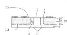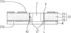 接着,请参考图2B,在核心层210中形成一贯孔H3,而贯孔H3可利用机械钻孔、雷射成孔或其它方式形成。接着,请参考图2C,将核心层210配置于一支撑板S上,且将一内埋元件E’置放于贯孔H3中,其中内埋元件E’具有至少一电极E1’(在图2C中设置有两个电极E1’)。在本实施例中,支撑板S可为一玻璃板、一聚对苯二酸乙烯酯膜或是其它材料所构成的板件;此外,内埋元件E’包括主动元件(例如是薄膜晶体管)及被动元件(例如是电阻、电容或电感)。值得注意的是,因为内埋元件E’与第二图案化线路层216是由支撑板S所支撑,所以内埋元件E’与第二图案化导电层216大约位于支撑板S的同一平面上。Next, please refer to FIG. 2B , a through hole H3 is formed in the