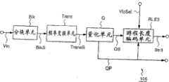 该分块单元Blk把图像信号Vin分为对应于块单元的图像信号,以产生像素值分量(分块的图像信号)BlkS。该频率变换单元Trans根据DCT(离散余弦变换)或者小波变换把该像素值分量BlkS变换为频率分量TransS。该量化单元Q根据量化参数QP量化该频率分量TransS,以输出量化分量QS,以及输出该量化单元Q。该游程长度编码单元RLE0c使得该量化分量QS受到游程长度编码,并且输出一个编码流Str0c。The blocking unit Blk divides the image signal Vin into image signals corresponding to block units to generate pixel value components (blocked image signals) BlkS. The frequency transformation unit Trans transforms the pixel value component BlkS into a frequency component TransS according to DCT (Discrete Cosine Transform) or wavelet transformation. The quantization unit Q quantizes the frequency component TransS according to a quantization parameter QP to output a quantized component QS, and outputs the quantization unit Q. The run-length encoding unit RLE0c subjects the quantized component QS to run-length encoding, and outputs an encoded stream Str0c.