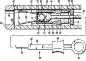 在盘管的前端部,通过焊接等固定有圆环状的止挡部件46,该止挡部件46具有与盘管的外径大致相等的外径,并且具有比盘管的内径小的内径。即,护套28的前端做成凸缘形状,在护套28的前端形成有内径减小的护套小径部48。利用该护套小径部48的后端侧形成前进限制止挡50。另一方面,在按压部件40的后端部形成有外径增大的前进限制大径部52。通过该前进限制大径部52与前进限制止挡50的抵接,来限制按压部件40相对于护套28的前进。An
