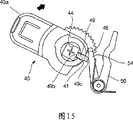 因此,上旋转齿轮24与蜗轮12一起旋转,并且随后第一钩件24a挤压扭簧30的端部32的第一侧。结果,扭簧30的直径减小,并且由此上旋转齿轮24的旋转力被转化成弹性力。在这种情况下,如果第二钩件22a不受限制,即下旋转齿轮22可以旋转,则端部32的第二侧利用扭簧30的弹性力挤压第二钩件22a,从而旋转下旋转齿轮22。然而,如果第二钩件22a受到限制,即在与下旋转齿轮22结合的锁扣装置40中发生干涉,由此下旋转齿轮22不能旋转,则扭簧30的直径因上旋转齿轮24的旋转力而减小,并且由此旋转力转换成被存储的弹性能。此后,如果第二钩件22a变得不受限制,即产生在锁扣装置40中的干涉被消除,并且由此下旋转齿轮22可以旋转,则扭簧30恢复。结果,端部32的第二侧利用弹性力挤压第二钩件22a,从而使下旋转齿轮22旋转。Accordingly, the