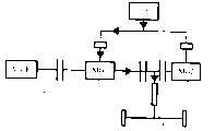 实践中还有通过离合器来实现各动力单元的动力分配的混联模式,如专利CN1200824C公开了一用于驱动车辆的混合驱动系统,该系统公开了使用双离合器、双电机以及电池的驱动系统,其第一电机、第二电机与内燃机之间分别布置第一离合器及第二离合器,并且其第二电机与一可变速比的变速器永久连接,其第一电机、第二电机与电池电连接。在该专利公开的技术方案中,由于第二电机与变速器永久连接,即第二电机与车轮之间永久通过变速器连接在一起,这就存在一个问题:当第二电机由于某些原因,如电池电量不足无法工作或出现故障无法工作或通过控制禁止其正常工作时,而需要发动机单独驱动车轮的时候,由于第二电机无法与车轮驱动轴断开,此时内燃机在驱动车辆的同时也将带动第二电机转动,此时第二电机就成为整个驱动系统的负载而耗费能量,使得驱动效率降低。In practice, there is also a hybrid mode in which clutches are used to realize the power distribution of each power unit. For example, patent CN1200824C discloses a hybrid drive system for driving vehicles. The system discloses a drive system using dual clutches, dual motors and batteries. A first clutch and a second clutch are respectively arranged between the first motor, the second motor and the internal combustion engine, and the second motor is permanently connected to a transmission with variable speed ratio, and the first motor and the second motor are electrically connected to the battery. In the technical solution disclosed in this patent, since the second motor is permanently connected to the transmission, that is, the second motor and the wheels are permanently connected through the transmission, there is a problem: when the second motor is due to some reasons, such as the battery When the battery is insufficient or fails to work or is prohibited from working normally by control, and the engine is required to drive the wheels alone, since the second motor cannot be disconnected from the wheel drive shaft, the internal combustion engine will also drive the vehicle while driving the vehicle. When the second motor rotates, the second motor becomes the load of the entire driving system and consumes energy, which reduces the driving efficiency.