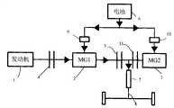 这种动力输出形式中,第一离合器4、第二离合器5均处于结合状态,第三离合器11处于结合或断开状态,从而使发动机的输出轴1与第一电动发电机2的旋转轴机械连接,使第一电动发电机2和第二电动发电机3同时与驱动轴机械连接;根据第一、第二电动发电机的工作状态不同,这种动力输出形式可以有不同的能量流动形式。In this power output form, the