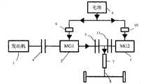 实践中出现的混联式模式有一种是通过行星齿轮机构来实现各动力单元的动力分配,在这种结构中,发动机与行星架相连,发动机的一部分功率通过第一电机转换为电能对第二电机供电或对储能装置进行充电,另一部分机械能直接作用于齿圈上,同时第二电机与齿圈相连,提供部分功率和转矩。在这种模式中,发动机输出动力中总有一部分能量供第一电机发电给蓄电池充电或供第二电机电动使用。One of the hybrid models that appear in practice is to realize the power distribution of each power unit through a planetary gear mechanism. In this structure, the engine is connected to the planetary carrier, and part of the power of the engine is converted into electric energy by the first motor to the second. The motor supplies power or charges the energy storage device, and another part of the mechanical energy directly acts on the ring gear, while the second motor is connected to the ring gear to provide part of the power and torque. In this mode, part of the energy output by the engine is always used by the first electric motor to charge the storage battery or by the second electric motor for electric use.