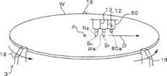 The supply of IPA liquid and the supply of nitrogen gas may be started simultaneously. For example, by starting to supply IPA liquid and nitrogen gas when thefluid nozzle 12 is moved to a position directly above the rotation center Po of the wafer W, the IP liquid may be supplied from the rotation center Po of the wafer W, and the nitrogen gas may be supplied from a position slightly farther behind the rotation center Po in the nozzle moving direction D. Alternatively, the supply of the nitrogen gas may be started when the dryinggas nozzle 13 is moved to a position directly above the rotation center Po of the wafer W after the start of the supply of the IPA liquid, whereby the supply of the nitrogen gas is started from the rotation center Po of the wafer W. Alternatively, the supply of the IPA liquid and the supply of the nitrogen gas are started slightly farther behind the rotation center Po in the nozzle moving direction D.