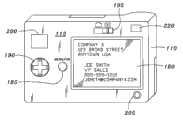 图6为类似传统数码相机的装置100的一其它实施例的一后视立体图。本体110的后表面112可包括一显示屏幕180,例如一液晶屏幕。显示屏幕180在图像采集过程中显示主体的一图像,让使用者于需要时可进行任何调整。显示屏幕180还可以显示采集图像,让使用者重新观看,如此使用者于需要时可重复操作。一存储器插槽210可用以容纳一可移动存储器存储模块。电源供应输入205可供以连接一交流电源供应器。选单按钮185可用以处理及控制与控制单元190有关的装置的功能或程序。图像搜寻器200可供使用者观看图像主体。使用者可在图像搜寻器200及显示屏幕180之间切换图像。模式选择器195可用以选择装置100的模式,例如使用装置100作为名片读取机或数码相机。如果上面板115自本体旋转移置时装置100未自动启动,则可包括电源按钮220。一合适的实体连接器可被插入数据传输装置输入215以使采集的影像传输到外部装置更方便。FIG. 6 is a rear perspective view of another embodiment of a conventional digital camera-