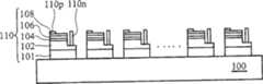图1-3显示本发明一实施例的制作过程。图1显示本发明实施例中,其上形成有多个发光二极管管芯的基底。如图1所示,首先提供基底100。在一实施例中,可将多个独立的发光二极管管芯110贴合于基底100上。在另一实施例中,亦可直接采用发光二极管的外延基板作为基底100,并将其上的外延叠层图案化,而于基底100上形成多个分离的发光二极管管芯110。每一第一发光二极管管芯还包括p型电极110p与n型电极110n。在随后工艺中,p型电极110p与n型电极110n将与形成于透明基板上的图案化导电层电性接触,透过图案化导电层而与外电源(例如交流电源)或其他发光二极管管芯电性连接。p型电极110p可包括金、镍、铂、铝、锡、铟、铬、钛、前述的合金、前述的叠层、或前述的组合。n型电极110n可包括钛、铝、金、铜、锌、前述的合金、前述的叠层、或前述的组合。发光二极管管芯110可发出大抵单一波长的光线,其可为紫外光、可见光、或红外光。1-3 show the fabrication process of an embodiment of the present invention. FIG. 1 shows a substrate on which a plurality of LED dies are formed in an embodiment of the present invention. As shown in FIG. 1 , a