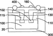 在前述将封胶体20的每一个芯片完成图案化的金属线段140后,紧接着,要进行对外连接元件的配置。如图3F所示,在封胶体20的金属线段140的面上,形成一图案化的保护层160(例如:聚酰亚胺)以覆盖多个图案化的金属线段140,并曝露出多个图案化的金属线段140的自由端。此形成图案化的保护层160的步骤包括:形成一保护层160在多个图案化的金属线段140上;利用半导体工艺,例如显影,先形成一图案化的光阻层(未在图中表示)在保护层160上;接着,在进行显影后,移除相对于多个图案化的金属线段140的向外延伸的自由端,即可曝露出每一个图案化的金属线段140的向外延伸的自由端。紧接着,在每一个曝露的自由端处形成多个导电元件400,其中导电元件400可以是锡球(solder ball)或是金属凸块(metal bump),如图3F所示。很明显地,导电元件400可以依据电路设计的需求进行配置,例如:配置成一种球阵列(BGA)的配置。After the patterned