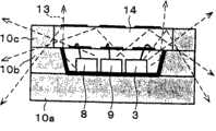 而且,由于在使发光装置小型化时,覆盖发光元件用的部分的厚度将变薄,使得光可以透过这种材料,所以还存在有朝向正面的发光效率会降低的问题。 Furthermore, when the light-emitting device is miniaturized, the thickness of the portion covering the light-emitting element is reduced so that light can pass through the material, so there is also a problem that the luminous efficiency toward the front is lowered. the