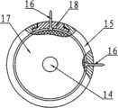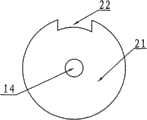 Embodiment 1: a kind of safe rolling type meat detection stamp, as Fig. 1, Fig. 3, Fig. 4, shown in Figure 5, it comprises thatseal rolls parts 1, rotating shaft 2, paintedhairbrush 3, support 4 andhandle 5, described support 4 is the U type, it is made up of twovertical plates 41 and atransverse slat 42,seal rolls parts 1 and is sleeved between twovertical plates 41 of U type support 4 by rotating shaft 2, describedseal rolls parts 1 and comprises draw point cover forseat 15, magnetic tapetrailer draw point 16,plug 17, two camberedsurface date block 18, on draw point cover forseat 15, be provided with mouth of connecting trough 19, two camberedsurface date block 18 are by external arc 181, interior circular arc 182, connect dop 183 and pin hole 20 compositions, the diameter of the diameter of external arc 181 and interior circular arc 182 is identical with internal diameter with draw point cover forseat 15 external diameters, the shape of pin hole 20 and size are corresponding with the handle footpath of magnetic tapetrailer draw point 16, the cross sectional shape that connects dop 183 is corresponding with the shape of mouth of connecting trough 19, on draw point cover forseat 15 and two camberedsurface date block 18, be equipped with pin hole 20, in all pin holes 20, magnetic tapetrailer draw point 16 is housed all, two camberedsurface date block 18 are installed in the mouth of connecting trough 19 of draw point cover forseat 15,plug 17 is sleeved in the endoporus of draw point cover forseat 15, its external diameter is pushed down the afterbody of all magnetic tapetrailer draw points 16, is provided withcentre bore 14 at the center of plug 17.Roll at seal between twovertical plates 41 of the two ends ofparts 1 and support 4 and be provided withtrim ring 21, the external diameter oftrim ring 21 is identical with the external diameter of draw point cover forseat 15, ontrim ring 21, be provided with abreach 22, to roll the position of the two camberedsurface date block 18 on theparts 1 corresponding for offer position and the seal of thisbreach 22, the disassembling, assembling and replacing of two camberedsurface date block 18 is convenient to greater than the cross section of two camberedsurface date block 18 in the cross section ofbreach 22.