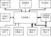 As shown in Figure 1, the present invention includes a human-machine interface module 1, a master controller 2, an environment monitoring module 3, a robot locating module 4, a motor drive module 5, a vision module 6, avoice module 7, a data memory module 8, a wireless data transfer module 9 and a power management module 10.