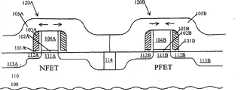 本发明有关于集成电路的制作,特别是通过等效应变记忆方法引入的应变技术,分别为互补金属氧化物半导体场效用晶体管CMOS中的NFET与PFET器件提供张应变与压应变,从而提高器件与电路的频率特性。The invention relates to the manufacture of integrated circuits, especially the strain technology introduced by the equivalent strain memory method, which provides tensile strain and compressive strain for NFET and PFET devices in complementary metal oxide semiconductor field effect transistor CMOS, thereby improving the device and The frequency characteristics of the circuit.