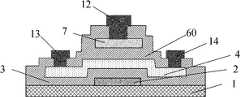图8示出了形成金属电极后的结构图。在图7结构的基础上用磁控溅射法淀积一层100~300nm厚的金属钛膜,然后光刻和刻蚀形成晶体管各电极的金属引出电极和互连线,同时连接顶部栅电极7和底部栅电极2。在一种实施方式中,12为栅极引出线,13为源极引出线,14为漏极引出线。FIG. 8 shows a structure diagram after forming metal electrodes. On the basis of the structure in Figure 7, deposit a layer of 100-300nm thick metal titanium film by magnetron sputtering, then photolithography and etching form the metal lead-out electrodes and interconnection lines of each electrode of the transistor, and connect the top gate electrode at the