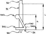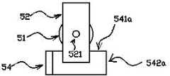 如图5、图6和图7所示,电极销5包括:竖直的圆柱型销身51;固定在销身51正上方的长方体销把52;固定在销身正下方的电极触点53;固定在销身51侧面,且底端与销身51底端相连的弹片组54。其中销身51母线长L,L=1.8CL。销把52和电极触点53的几何中心都在销身51的中轴线上。销身51和销把52在前者中轴线上有一导线孔521,导线孔521贯穿销身51与销把52,导线7通过导线孔521连接至电极触点53。弹片组54包括基板541、弹片542、滚头543及连接板544。基板541为水平的长方形板,其边541a通过连接板544与销身51连接。弹片542也是一长方形板,弹片542的一边542a与基板541中的边541a的临边重合。滚头543为一圆柱型结构,固定在弹片边542a的对边。滚头543的母线与销身51母线垂直,滚头543的侧面与弹片542相切。弹片组54整体高度为h,h=CL。弹片组54材料为弹性材料,如弹性塑料、薄铜片等。电极销5与电极座2配合使用。在装配时,先将电极销5在插入电极座2,此时销身51穿过插孔21的圆形孔部分,弹片组54穿过插孔21的矩形部分进入脑电帽内部。电极销5与电极座2相配合时,电极销5穿过插孔21插进脑电帽,其中电极销销身51穿过插孔21的圆形孔,弹片组54穿过插孔21的方形孔。电极销5插入电极座2后,保持电极座2不动,通过销把52针转动电极销5半圈,这时由于销身51母线长度L<h+CL,弹片542被压弯,电极销5被固定在电极座2上,电极触点53指向头部。As shown in Figure 5, Figure 6 and Figure 7, the
