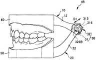 (8)包含配置在第1保持部321上的保持部侧磁铁323B来构成髁道部32,包含吸附部件315和突出部侧磁铁316来构成髁头部312B,所述吸附部件315在咬合器1B闭状态下被配置在与第1保持部321对置的位置上,所述突出部侧磁铁316在咬合器1B开状态下被配置在与第1保持部321对置的位置上并排斥保持部侧磁铁323B。由此,可以在咬合器1B的开状态下,在使髁头部312B和第1保持部321沿第1方向D1离开的状态下连结上颌支持部10和下颌支持部20。由此,可以在开状态下容易地再现与闭状态不同的咬合状态。(8) The