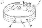 在本实施例中,项圈或皮条 10 可能有导线或其他传输零部件 32 内嵌其中,用以将能量从控制面板 20 传递到整个设备 10。In this embodiment, the collar or