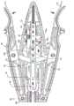 步进梁可以包括多个朝向远侧并且延伸进入所述夹子通道中的坡道,其中,步进梁的朝向远侧的坡道被配置为选择性地接合在夹子从动件中限定的第一孔,并且在步进梁向远侧运动时驱使所述夹子从动件向远侧运动,并且其中,夹子承载器的朝向远侧的坡道被配置为选择性地接合在夹子从动件中限定的第二孔,并且在步进梁向近侧运动时使得夹子从动件向近侧的运动停止。The walking beam may include a plurality of distally facing ramps extending into the clip channel, wherein the distally facing ramps of the walking beam are configured to selectively engage a first ramp defined in the clip follower. and wherein the clip follower is urged to move distally as the walking beam moves distally, and wherein the distally facing ramp of the clip carrier is configured to selectively engage the clip follower defined in the clip follower and stop the proximal movement of the clip follower as the walking beam moves proximally.