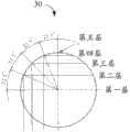 例如,表面点计算模块102根据标准球30的半径R1、所述顶部任意点的坐标PT及在所述标准球30上取点的个数为Num,按照比例把该标准球30分成多层。由于量测时,标准球30的下半部分不会与工件接触,因此,本实施例将该标准球30的上半部分进行等比例划分,如图4所示,以22.5度的夹角将该标准球30的上半部分进行等比例划分后共得到五层,每层上的表面点的个数可以由公式大致计算得出。如第一层的表面点个数=(Num-1)*33.3%,第二层的表面点个数=(Num-1)*16.7%,第三层的表面点个数=(Num-1)*33.3%,第四层的表面点个数=(Num-1)*16.7%,第五层的表面点个数=1。其中,第一层即所述标准球30的球心所在的层,第五层即所述标准球30顶点所在的层。For example, the surface point calculation module 102 divides the