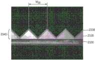 图23是复合材料制品2400(参见图24)的示例性实施例的剖视样品的显微图,该制品在微结构化层2345内具有不止一个相异图案固化层。第一层2336具有第一可辐射固化树脂,该树脂被相异图案固化而包括第一区域2431,第二层2335具有第二可辐射固化树脂,该树脂被相异图案固化而包括第一区域2436(即,可以看出微结构化层可包括不止一个相异图案固化层,各层中具有不同的图案)。FIG. 23 is a micrograph of a cross-sectional sample of an exemplary embodiment of a composite article 2400 (see FIG. 24 ) having more than one distinctly patterned cured layer within a