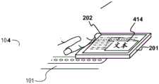 In an alternative variation of the embodiment described with respect to fig. 4A-4B, the subdivision or similar decomposition of the displayed portion of the content need not be strictly performed. Alternatively, theprogram 210 may simply track user activation of a portion of thetouchpad 204, associate the activated portion with a corresponding region of content displayed on the screen, and present anenlarged view 414 of the content in the corresponding region, as shown in FIG. 4D. This makes it easier to see and use the selected active elements shown on the screen. This also allows for enhanced usability of thevisual display 202 in the case where the visual display is also a touch screen.