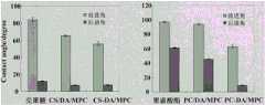 如图2所示,本实施例经涂层处理的壳聚糖和聚碳酸酯材料与未经涂层处理的壳聚糖和聚碳酸酯材料相比,经涂层处理的壳聚糖和聚碳酸酯的前进角和后退角均有所降低。与CS/DA/MPC和PC/DA/MPC相比,CS-DA/MPC和PC-DA/MPC前进角和后退角较低,这是因为双仿生多巴胺磷酰胆碱物质DA/MPC通过高温及Tris-HCl溶液处理使得较多的多巴胺粘附固定在基材表面,以致表面磷酰胆碱基团较多,获得具有仿细胞外层膜结构的表面,使得其亲水性显著提高,前进角和后退角明显降低。As shown in Figure 2, the chitosan and polycarbonate materials treated with the coating in this example are compared with the uncoated chitosan and polycarbonate materials. Both the advancing and receding angles of the carbonate are reduced. Compared with CS/DA/MPC and PC/DA/MPC, CS-DA/MPC and PC-DA/MPC have lower advancing and receding angles, which is because the dual biomimetic dopamine phosphorylcholine substance DA/MPC passes high temperature and Tris-HCl solution treatment makes more dopamine adhere and fix on the surface of the substrate, so that the surface phosphorylcholine groups are more, and a surface with a cell-like outer membrane structure is obtained, which makes its hydrophilicity significantly improved, and the Angle and receding angle are significantly reduced.