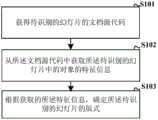 由上述的技术方案可见,本发明实施例提供了一种幻灯片识别的方法及装置,应用于电子设备中,所述方法包括获得待识别的幻灯片的文档源代码,从所述文档源代码中获取所述待识别的幻灯片中的对象的特征信息,根据获取的所述特征信息,确定所述待识别的幻灯片的版式。由于本发明实施例能够通过幻灯片文档源代码,自动化地获取待识别幻灯片中对象的特征信息,在识别幻灯片版式的效率和准确性上相较人工识别均有显著的提高,同时为后续基于幻灯片版式的幻灯片自动化处理带来可能。It can be seen from the above technical solutions that an embodiment of the present invention provides a method and device for identifying slides, which are applied to electronic equipment. The feature information of the object in the to-be-recognized slide is obtained in the , and the layout of the to-be-recognized slide is determined according to the obtained feature information. Because the embodiment of the present invention can automatically obtain the feature information of the objects in the slide to be recognized through the source code of the slide document, the efficiency and accuracy of recognizing the slide layout are significantly improved compared with manual recognition, and at the same time, the subsequent It is possible to automate the processing of slides based on the slide layout.