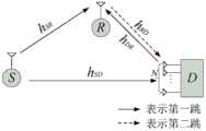 基于上述步骤,由于中继采用了放大转发协议,将第一时隙内中继接收的信号进行放大再转发给D。因此,R发送的信号可以表示为xR=βyR,其中β是放大转发中继节点的功率放大因子,它可以表示为β2=1/(PS|hSR|2+PD|hDR|2+σ2),其中PS为S的发送功率,PD为D的发送功率,hSR为S至R的信道参数,hDR为D至R的信道参数。Based on the above steps, since the relay adopts the amplification and forwarding protocol, the signal received by the relay in the first time slot is amplified and then forwarded to D. Therefore, the signal sent by R can be expressed as xR =βyR , where β is the power amplification factor of the amplify-and-forward relay node, which can be expressed as β2 =1/(PS |hSR |2 +PD |hDR |2 +σ2 ), where PS is the transmit power of S,PD is the transmit power of D, hSR is the channel parameter from S to R, and hDR is the channel parameter from D to R.